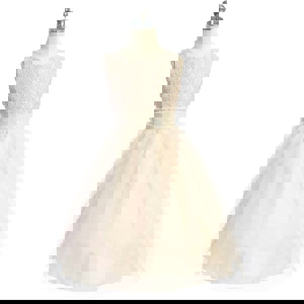 The sleeveless lace bodice features layers of blush glittered tulle skirt and sequin waist trim. The back bodice has a dramatic V accented design with matching sequins. The Belle dress is also finished with a matching oversized sequin bow at the back to make this the perfect occasion dress.