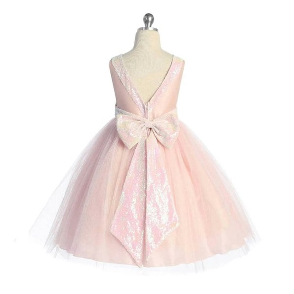 Dupioni bodice with layers of glitter tulle skirt and baby pink iridescent sequin waist trim. The back bodice has a dramatic V accented design with pink iridescent sequins. Dress is finished with a sequin bow in the back to make this the perfect party dress.