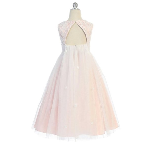 A full length floaty occasion dress with lace upper bodice. The back design features a triangle cut out, with a pretty floaty mesh waterfall. The skirt and waterfall have a layer of glittered tulle giving the skirt an extra sparkle and shine. The waterfall also features small pretty satin flowers with the waist accented with pretty diamond shape rhinestones in a braided design.