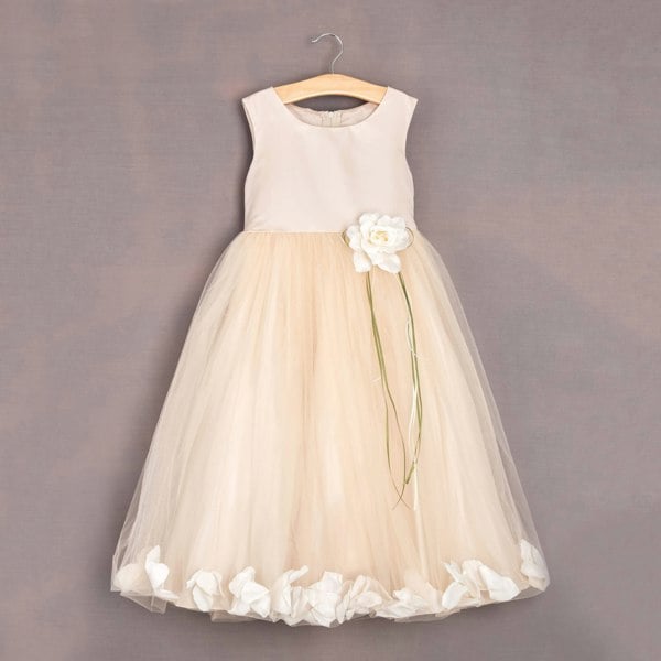 Blush satin bodice, nipped in at the waistband with attached long length blush tulle skirt. The added blush and ivory scatter petals and the matching pin on flower are a truly stunning colour combination that blend beautifully.