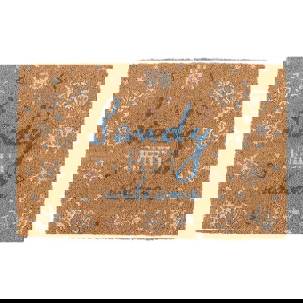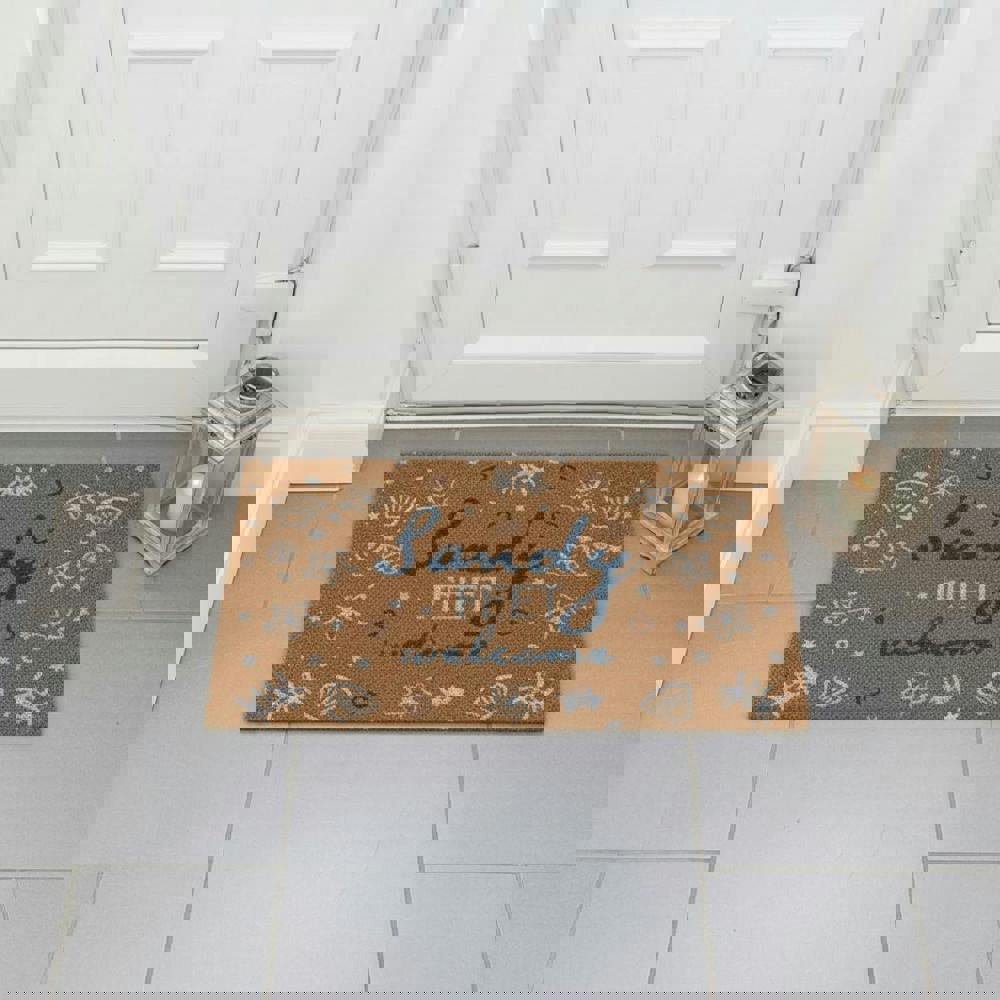 Embrace a relaxed, seaside aesthetic with this coastal-themed "Sandy Feet Welcome" doormat. Designed specifically for beach houses, holiday homes, or anyone wishing to bring the ocean breeze to their doorstep, this mat features a charming array of nautical illustrations, including starfish, seashells, and crabs. The soothing blue and white tones of the script and motifs offer a refreshing contrast against the warm, rustic tan of the natural coconut fibers. Crafted from high-quality natural coir, this mat is as functional as it is inviting. The coarse, durable bristles are engineered to effectively trap sand, salt, and dirt, ensuring your interior floors stay clean and protected. Recommended for indoor and sheltered use.