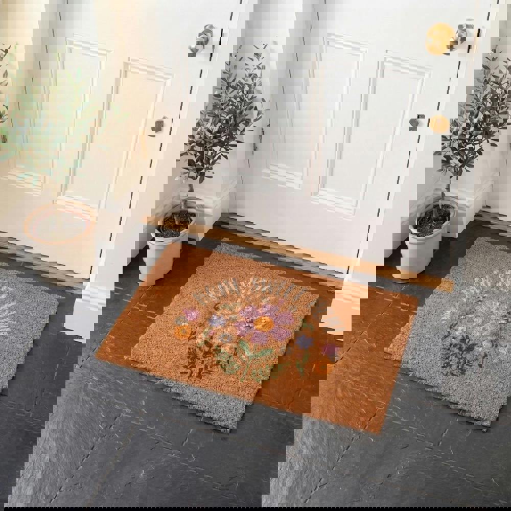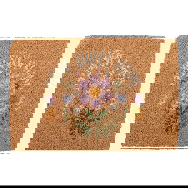 Celebrate the comfort of your living space with this charming "Home Sweet Home" botanical welcome mat. Featuring a beautifully illustrated wildflower motif—centered around a vibrant pink daisy and accented with delicate purple and yellow blooms—this mat brings a soft, garden-inspired touch to your doorstep. The classic sentiment is rendered in a clean, arched white script that stands out elegantly against the rustic tan of the natural coconut fibers. This mat is a perfect marriage of style and utility. Crafted from high-grade natural coir, the stiff bristles are designed to aggressively scrape mud, grit, and moisture from footwear, keeping your internal floors spotless. Suggested for sheltered and indoor use only.