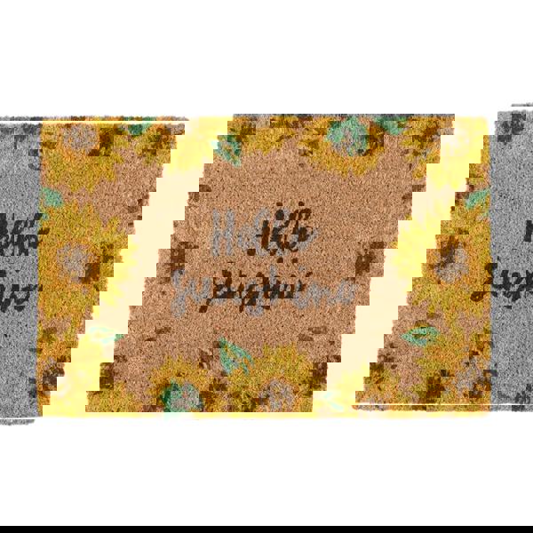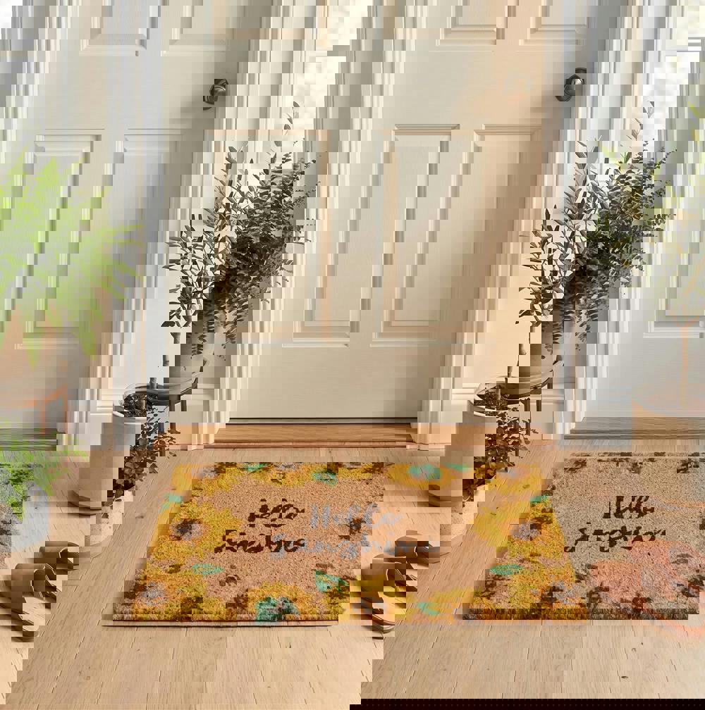 Brighten your home’s entrance with this cheerful and botanical "Hello Sunshine" welcome mat. Framed by a lush border of golden sunflowers and deep green foliage, this mat provides a warm, sunny greeting regardless of the weather outside. The vibrant yellow tones pop against the rustic, natural tan of the coconut fibers, creating a polished look that pairs beautifully with wood, tile, or stone flooring. Crafted from premium natural coir, this mat is designed for heavy-duty performance in a compact size. The stiff, resilient fibers are experts at trapping fine dust and scraping mud from the soles of shoes, ensuring your living space remains pristine. Suggested for sheltered and indoor use only.
