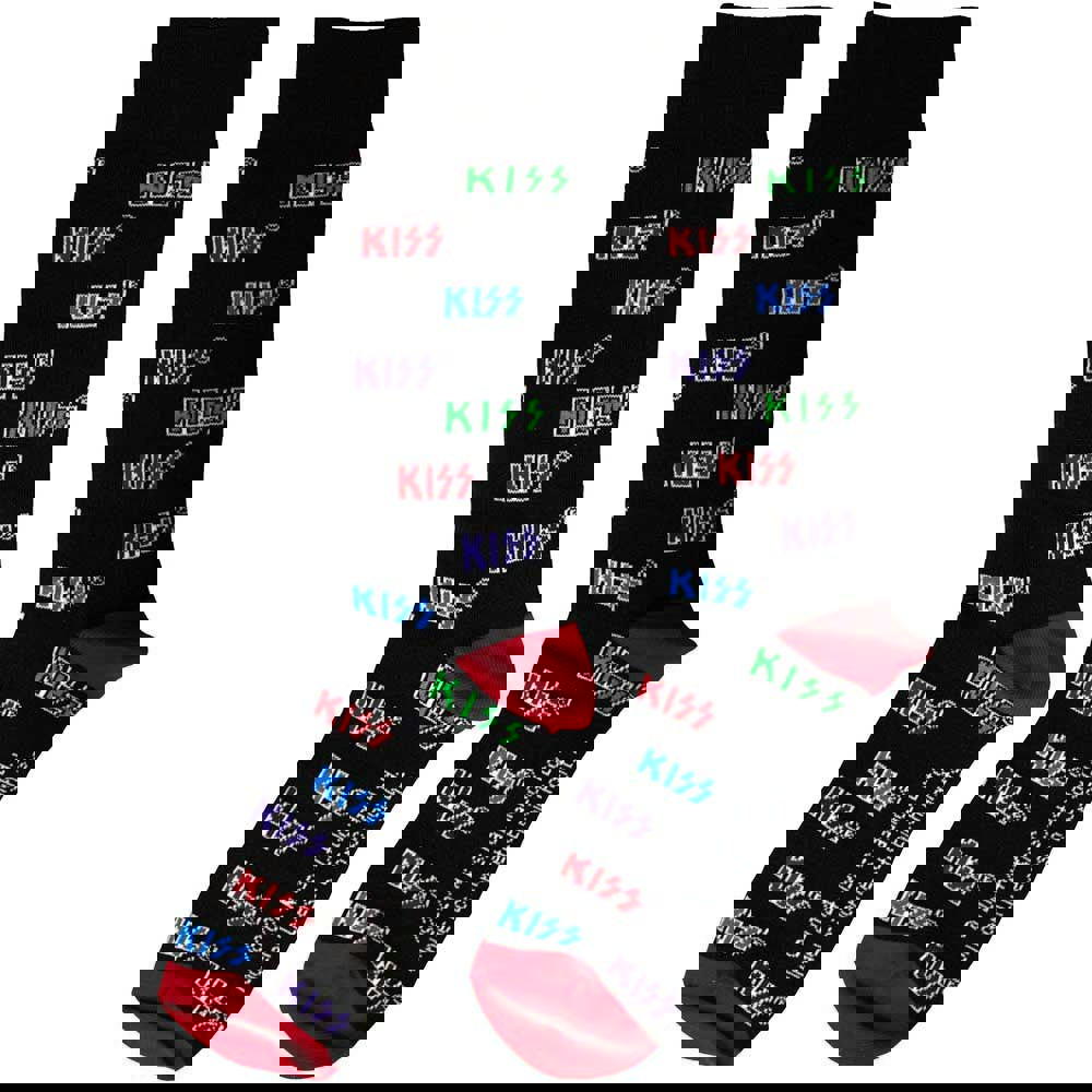 Official licensed KISS Unisex Ankle Socks featuring the 'Coloured Logos Pattern' design motif. High quality Ankle Socks available in a black colourway. These premium quality, colourful, all-over pattern cotton rich woven socks are guaranteed to stand out in the crowd.