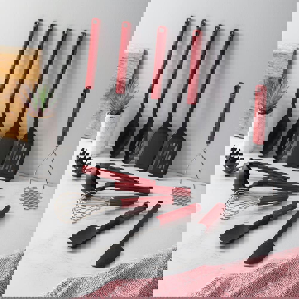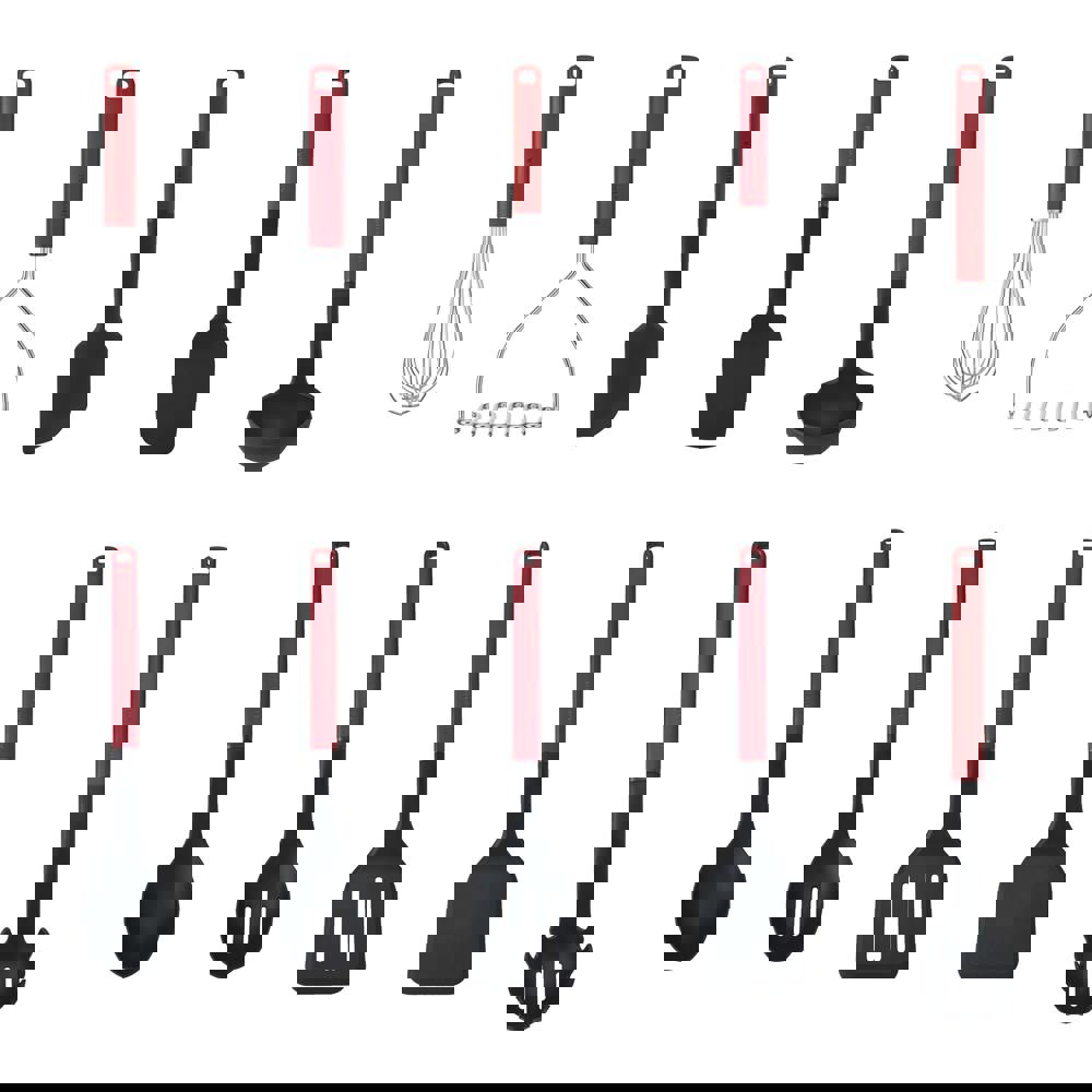 This complete 10-piece set includes a slotted turner, solid turner, cooking spoon, slotted spoon, ladle, potato masher, pasta server, utility whisk, scraper spatula, and spoon spatula, covering everything from stirring and flipping to mashing, whisking, and serving. Most utensils feature flexible, non-scratch silicone heads that are heat resistant up to 260°C (500°F), while the stainless steel whisk ensures efficient aeration for sauces, eggs, and more.