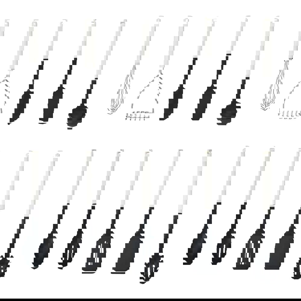 This complete 10-piece set includes a slotted turner, solid turner, cooking spoon, slotted spoon, ladle, potato masher, pasta server, utility whisk, scraper spatula, and spoon spatula, covering everything from stirring and flipping to mashing, whisking, and serving. Most utensils feature flexible, non-scratch silicone heads that are heat resistant up to 260°C (500°F), while the stainless steel whisk ensures efficient aeration for sauces, eggs, and more.
