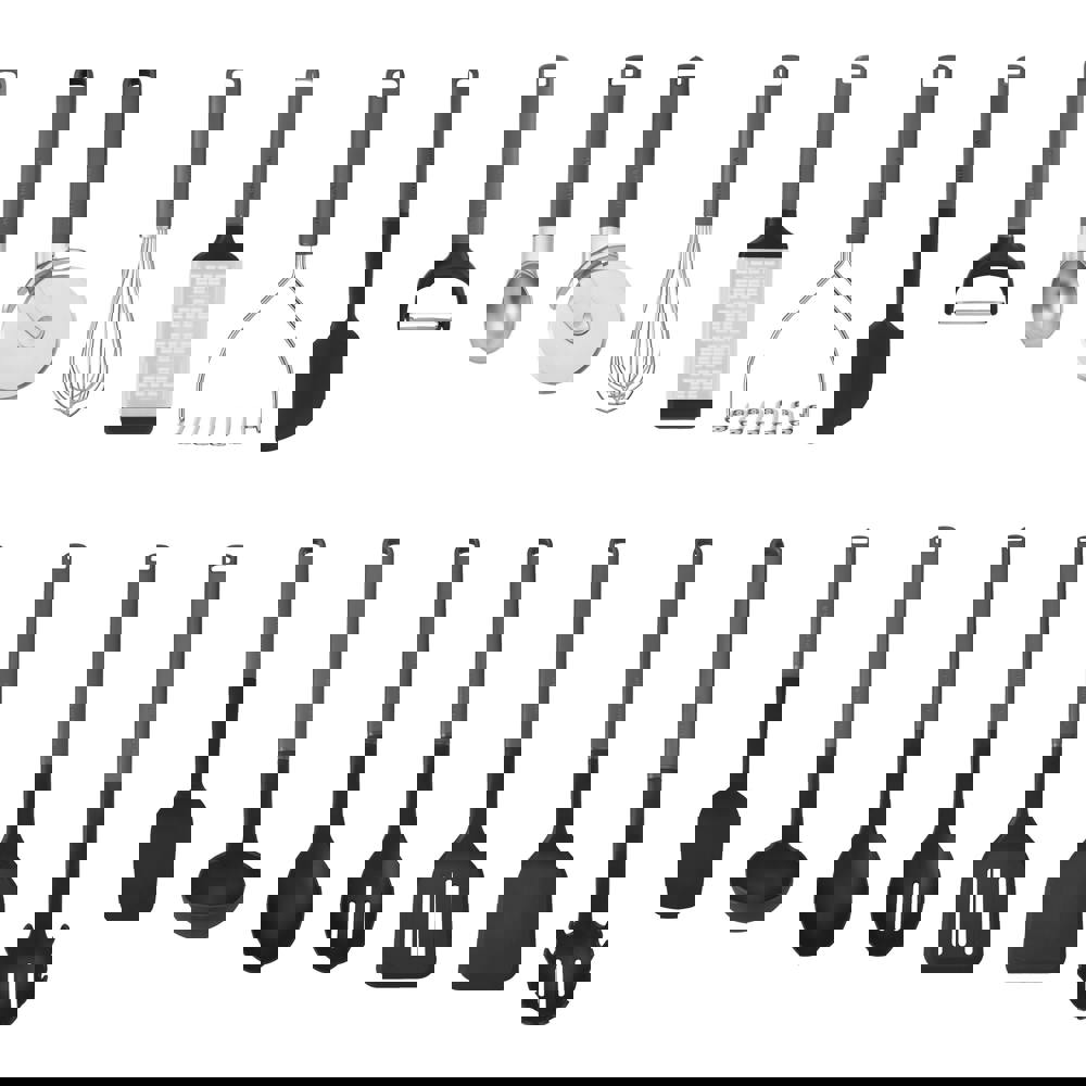 This comprehensive 14-piece set includes all the essentials: slotted and solid turners, cooking spoon, slotted spoon, ladle, potato masher, pasta server, utility whisk, scraper spatula, spoon spatula, Y-peeler, ice cream scoop, pizza wheel, and a medium grater. Whether you're flipping, stirring, mashing, grating, peeling, or serving, this set has you covered for every meal and occasion.