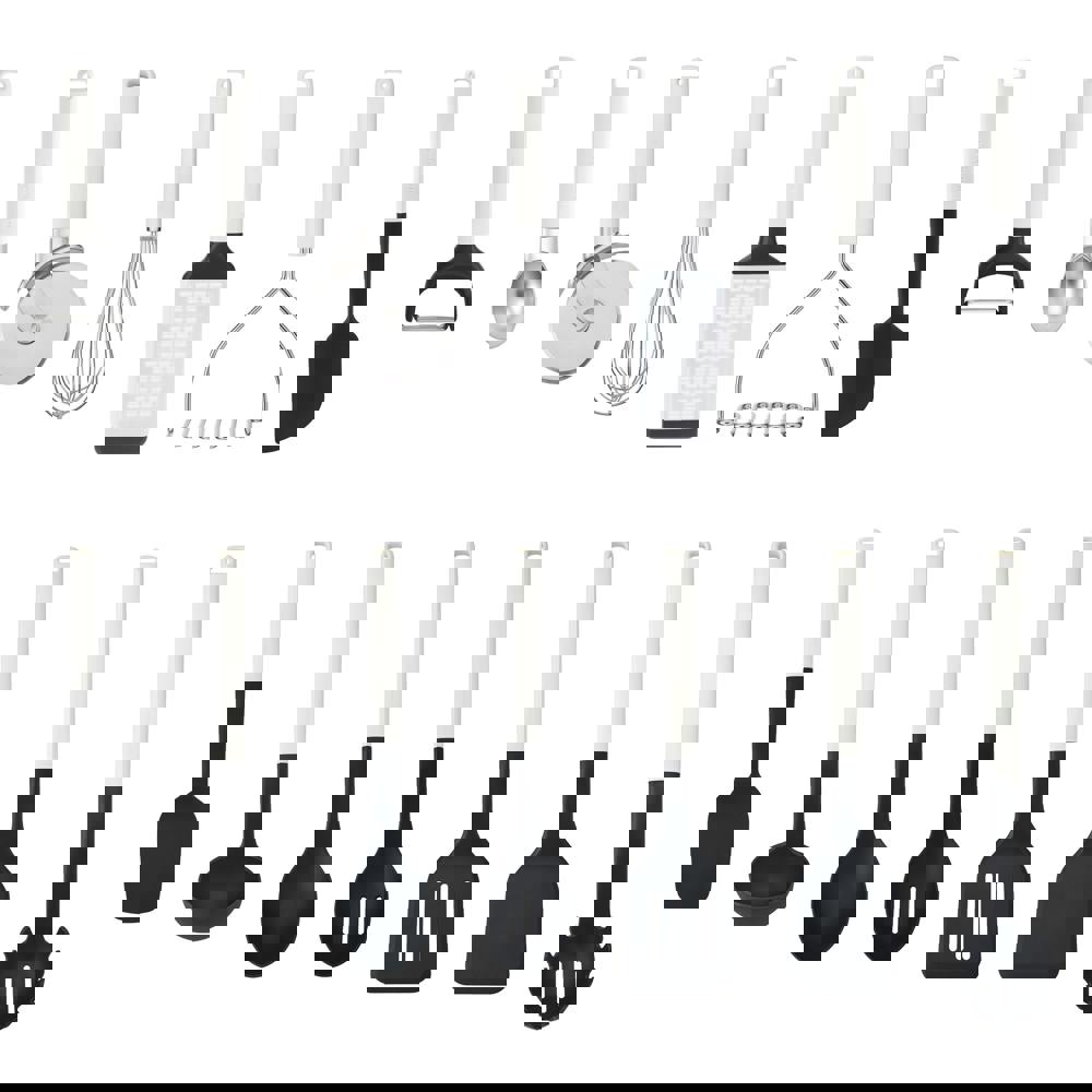 This comprehensive 14-piece set includes all the essentials: slotted and solid turners, cooking spoon, slotted spoon, ladle, potato masher, pasta server, utility whisk, scraper spatula, spoon spatula, Y-peeler, ice cream scoop, pizza wheel, and a medium grater. Whether you're flipping, stirring, mashing, grating, peeling, or serving, this set has you covered for every meal and occasion.