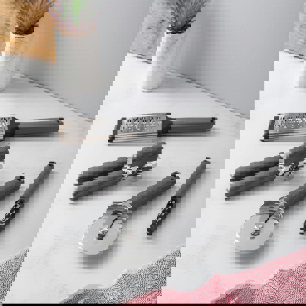 This handy 4-piece set includes a tin opener, pizza wheel, euro peeler, and medium grater, covering key tasks like opening cans, slicing pizza, peeling vegetables, and grating ingredients with ease and precision. All tools are designed for durability and performance, suitable for daily use.