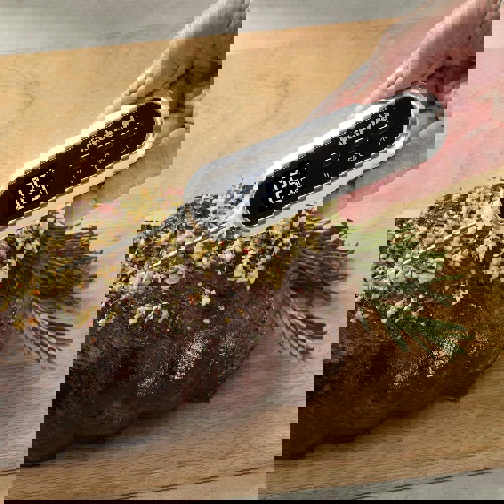 The KitchenAid Backlit Digital Instant Kitchen Thermometer instantly reads the internal temperatures of foods. The backlit LCD readout displays the temperature boldly and clearly, while the unique HOLD feature locks in the last recorded temperature so you can get your hand away from heat even quicker. Other features include an ultra-thin thermometer tip, a handy pocket/storage sleeve, and a Celsius/Fahrenheit conversion button. Combined with a temperature range that reaches a high 250°C/482°F, this thermometer will become one of the most useful tools in the kitchen. HELPFUL HINTS: Digital thermometers are not meant to be left in food during cooking. The plastic and electronic components could be damaged by excessive heat. IMPORTANT: The thermometer will be hot after use. Use oven gloves when handling hot thermometers.