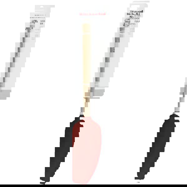 This KitchenAid Mixer Spatula is ideal for mixing, blending, and scraping ingredients. Its durable head is heat-resistant to 260 °C/500 °F. This spatula is made from eco-friendly birchwood and is safe to use on all cookware, including non-stick. Designed to match the shape of the KitchenAid Stand Mixer bowl. Features a stainless steel hanging hook. Lifetime Limited Warranty. Handwash for long-lasting performance.