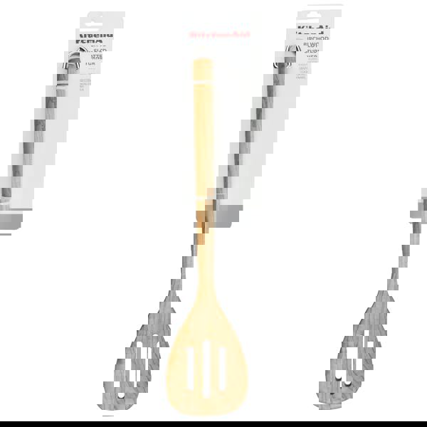 This KitchenAid Birchwood Slotted Turner is ideal for tossing and turning foods. You can also use it in place of a wooden spoon for stirring and sautéing. The head features slots for the excess liquid to pass through. Made from eco-friendly sustainable birchwood, this spatula is safe to use on all cookware, including non-stick and has a stainless steel hanging hook. Lifetime Limited Warranty. Handwash for long-lasting performance.