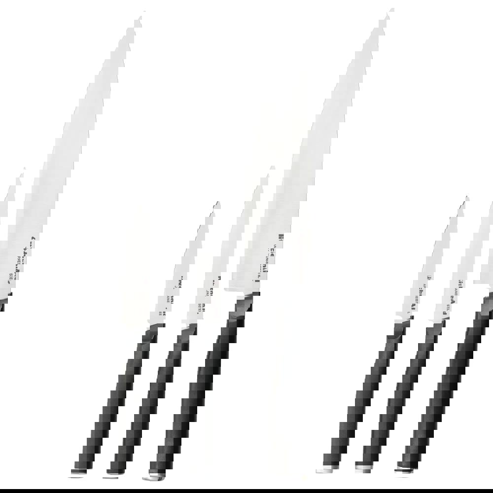 This KitchenAid Classic 3 piece chef set includes all the essential knives needed to perform everyday food prep tasks such as slicing, cutting, chopping, trimming, and more. Use the 20cm chef knife to chop, the 14cm serrated utility knife to cut through delicate crusts, and 9cm paring knife to peel, trim and garnish small fruits and vegetables. Blades are expertly crafted using semi-polished, high-carbon Japanese steel, hardened and tempered to provide a long-lasting edge for a professional, quality cut every time. These KitchenAid knives feature eastern-style ergonomic handles that provide optimal control for everyday use. Handles are expertly engineered with a textured finish for a comfortable grip and accented with a chrome endcap. Includes custom-fit blade covers for secure, safe storage. KitchenAid knives are top rack dishwasher safe. To extend the life of your knives, hand washing is recommended. Dry immediately.