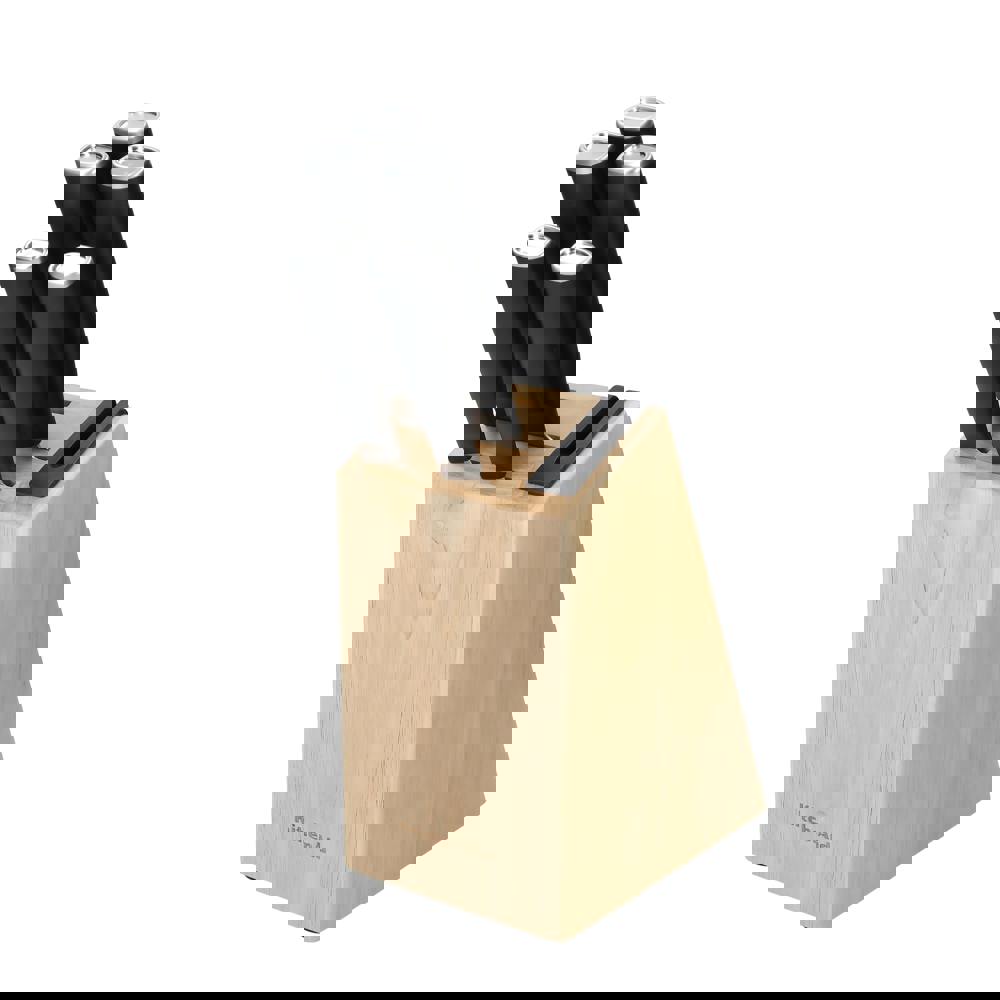 This KitchenAid five-piece knife block set includes all the essentials for everyday food prep tasks like trimming meat, chopping vegetables and slicing bread. The knives are expertly crafted using semi-polished, high-carbon Japanese steel, hardened and tempered to provide a long-lasting edge for a professional, quality cut every time. The eastern-style ergonomic handles provide optimal control for everyday use. The knives slot neatly into an attractive rubberwood knife block, which features a built-in knife sharpener so you can hone your knives with every use.