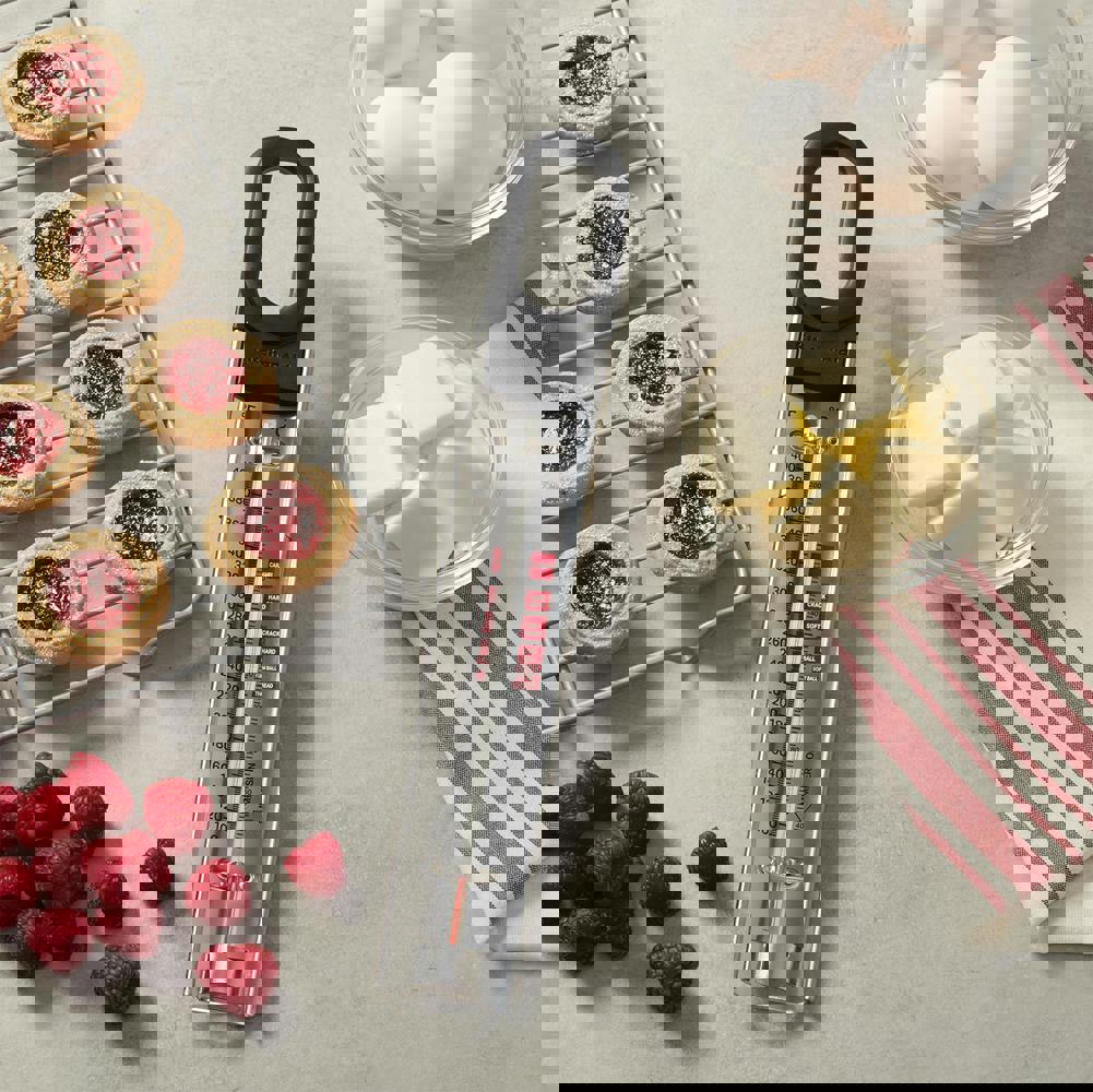 A classic paddle design is ideal for making sweets or tracking oil temperatures for deep frying. The KitchenAid Clip-On Cooking Thermometer has a curved stainless steel body that hugs the cookware sides for easier stirring and more evenly heated and consistent results. Includes an adjustable pan clip with a silicone coating that securely affixes the thermometer to almost all pan types and prevents scratching. An oversized stay-cool handle provides easy removal from the pan after use. Large, bold numbers are easy to read. Key temperature ranges are printed directly on the stainless steel to help monitor the cooking temperatures. Important: thermometer will be hot after use. Use oven gloves when handling the hot thermometer.