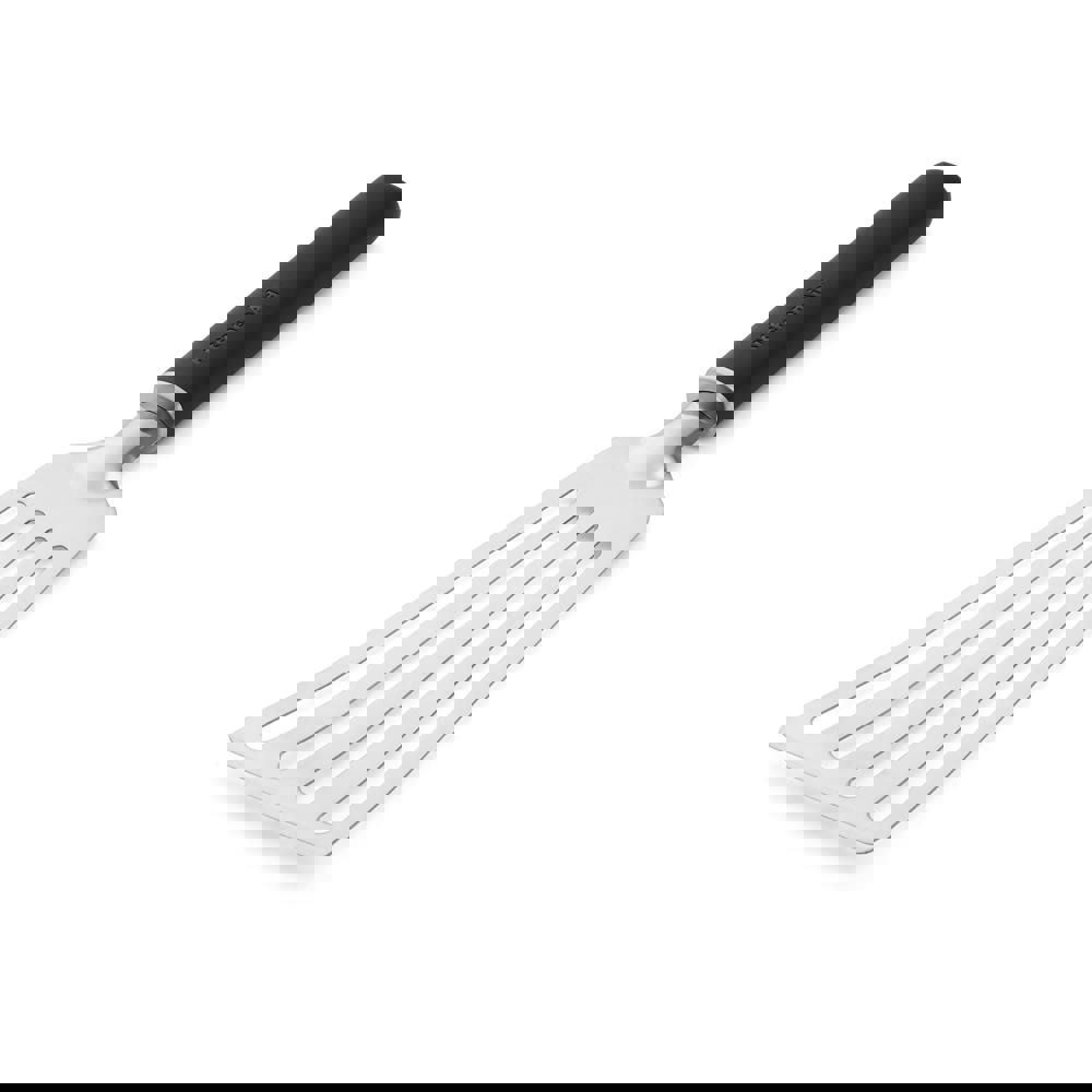 Measuring 31. 5cm and finished with a bold Matte Black handle, this flexible turner is perfect for handling fish, omelettes, crepes, and other fragile ingredients without breaking them apart. The flexible turner head is crafted from tempered, rust-resistant stainless steel that bends slightly to glide easily under food, making it ideal for folding, flipping, and lifting.
