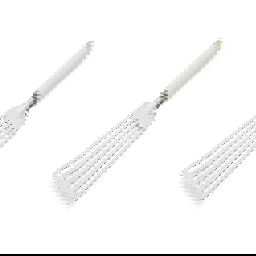 Measuring 31. 5cm and finished with a smooth Porcelain White handle, this flexible turner is perfect for handling fish, omelettes, crepes, and other fragile ingredients without breaking them apart. The flexible turner head is crafted from tempered, rust-resistant stainless steel that bends slightly to glide easily under food, making it ideal for folding, flipping, and lifting.