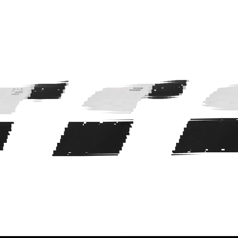 The KitchenAid santoku knife is a must-have for everyday meal prep. The ridges on the blade are specially designed to prevent foods from sticking while you slice, making it ideal for chopping and dicing vegetables. This forged knife is expertly crafted using semi-polished, high-carbon Japanese steel, hardened and tempered to provide a long-lasting edge for a professional, quality cut every time. This KitchenAid knife features an eastern-style ergonomic handle with a triple-riveted pin design that provides optimal control for everyday use. This handle is expertly engineered with a textured finish for a comfortable grip and accented with a stainless steel endcap. Includes a custom-fit blade cover for secure, safe storage. KitchenAid knives are top rack dishwasher safe. To extend the life of your knives, hand washing is recommended. Dry immediately.