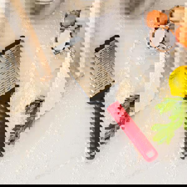 Finished with a bold empire red handle, this essential grater features unique micro-serrations that grate in both directions for faster, more efficient results, perfect for cheese, chocolate, vegetables, and more. The high-quality stainless steel grater head offers strength and precision, while the cushioned non-slip foot provides added stability for grating directly into bowls, onto cutting boards, or over any flat surface. A protective blade cover is included for safe storage when not in use.