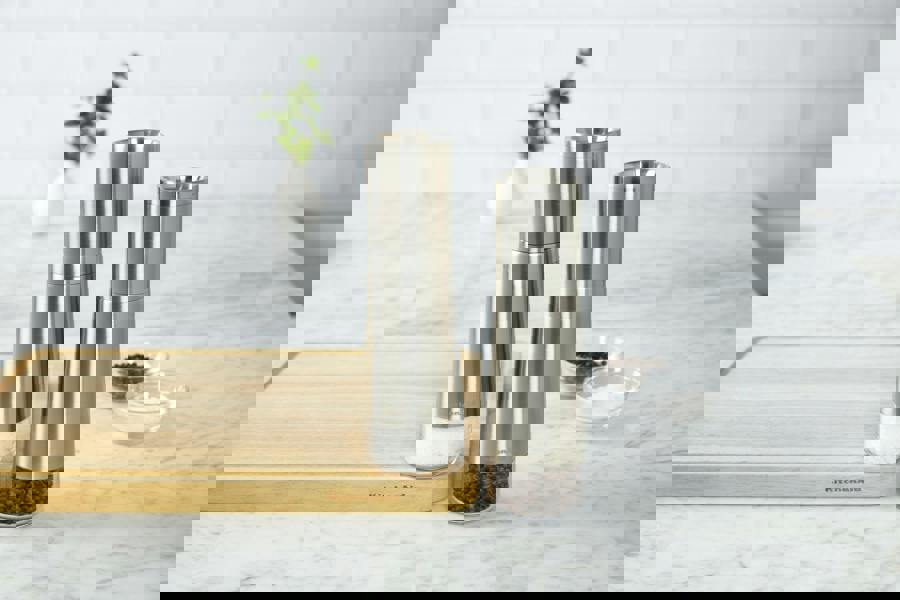 Easily add flavour to food with this Salt and Pepper Grinder Set by KitchenAid. These essential, adjustable tools feature a ceramic grinding mechanism that easily and neatly distributes a fine or coarse grind. The twist-off tops allow for quick, easy refilling, and the clear window shows when contents are running low. Made from durable stainless steel with a corrosion-free ceramic mechanism for long-lasting use. Hand wash only. Includes a Lifetime limited warranty and one-year hassle-free replacement.