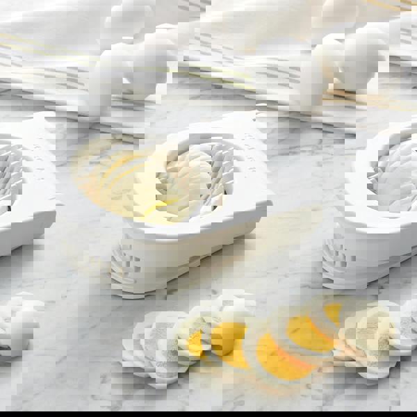 This essential Egg Slicer from KitchenAid is perfect for making thin, uniform slices of hard-boiled eggs, mushrooms, soft cheeses and more. It’s easy to use; simply place food in the bed and gently press the top down over the food. The non-slip base ensures that the slicer stays in place during use. This strong, reliable tool is durably made, with a steel-wire cutter that provides a clean cut every time and never needs to be sharpened.