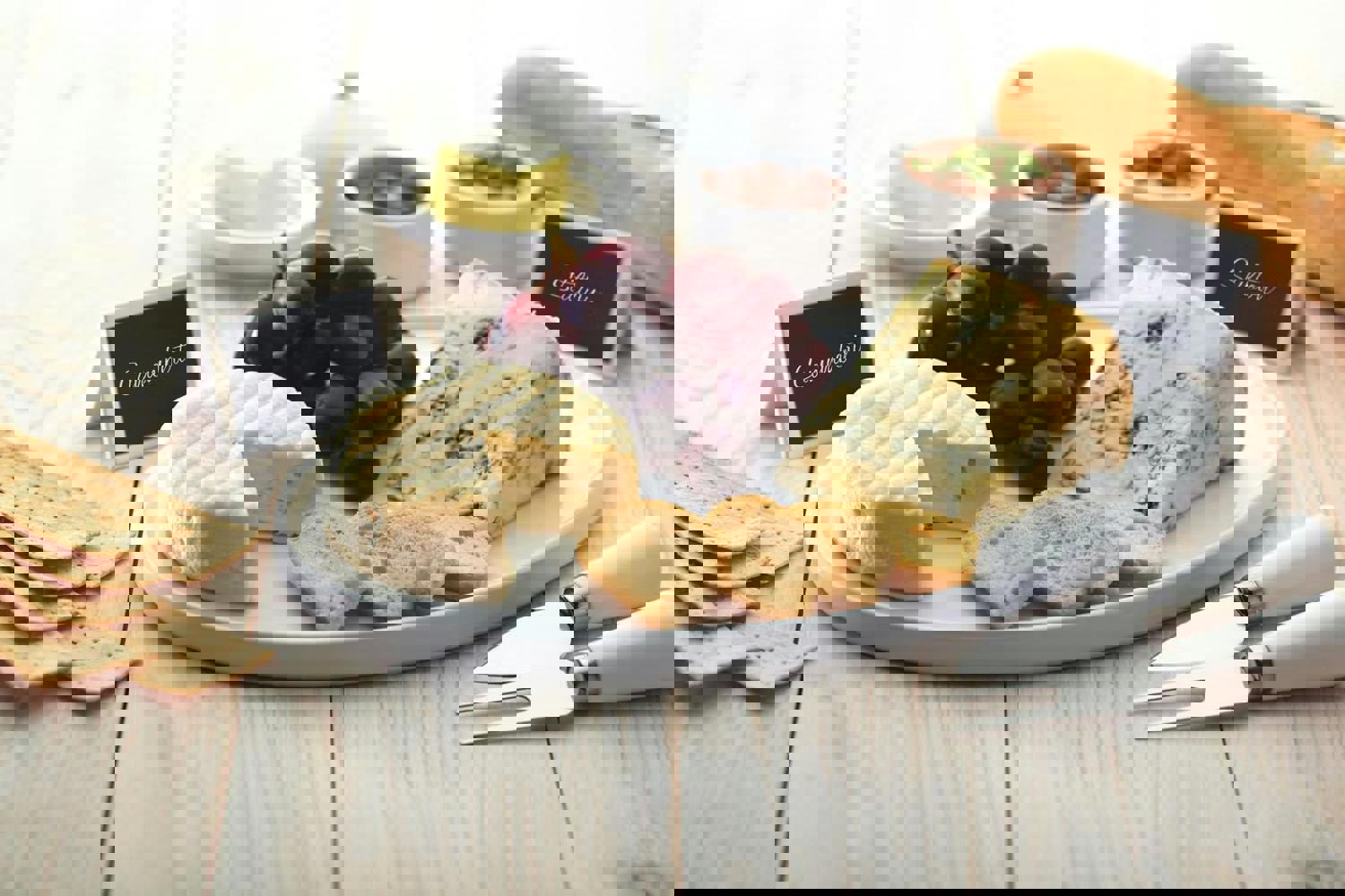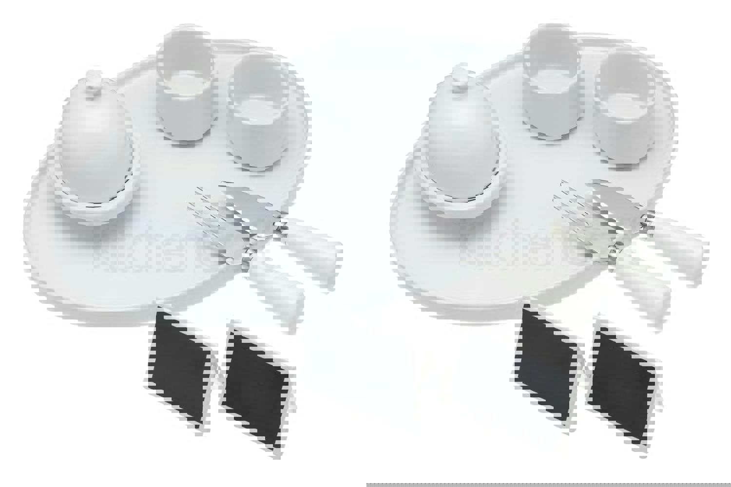 Make cheese and biscuits a real feature dessert with this complete serving set. Including a ceramic white oval platter for serving the cheese with a butter cloche and two small dishes for serving grapes, chutney or olives, two blackboard cheese markers complete with chalk and of course a cheese knife and fork. 31cm / 12". Simple elegance that doesn't cost the earth