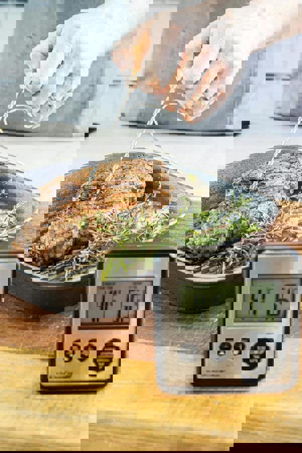 It’s particularly good for roast meat and poultry, because it can sit outside your oven and measure the meat’s internal temperature inside. When it reaches your target time or temperature, it lets out a clear, audible alarm. Easy!