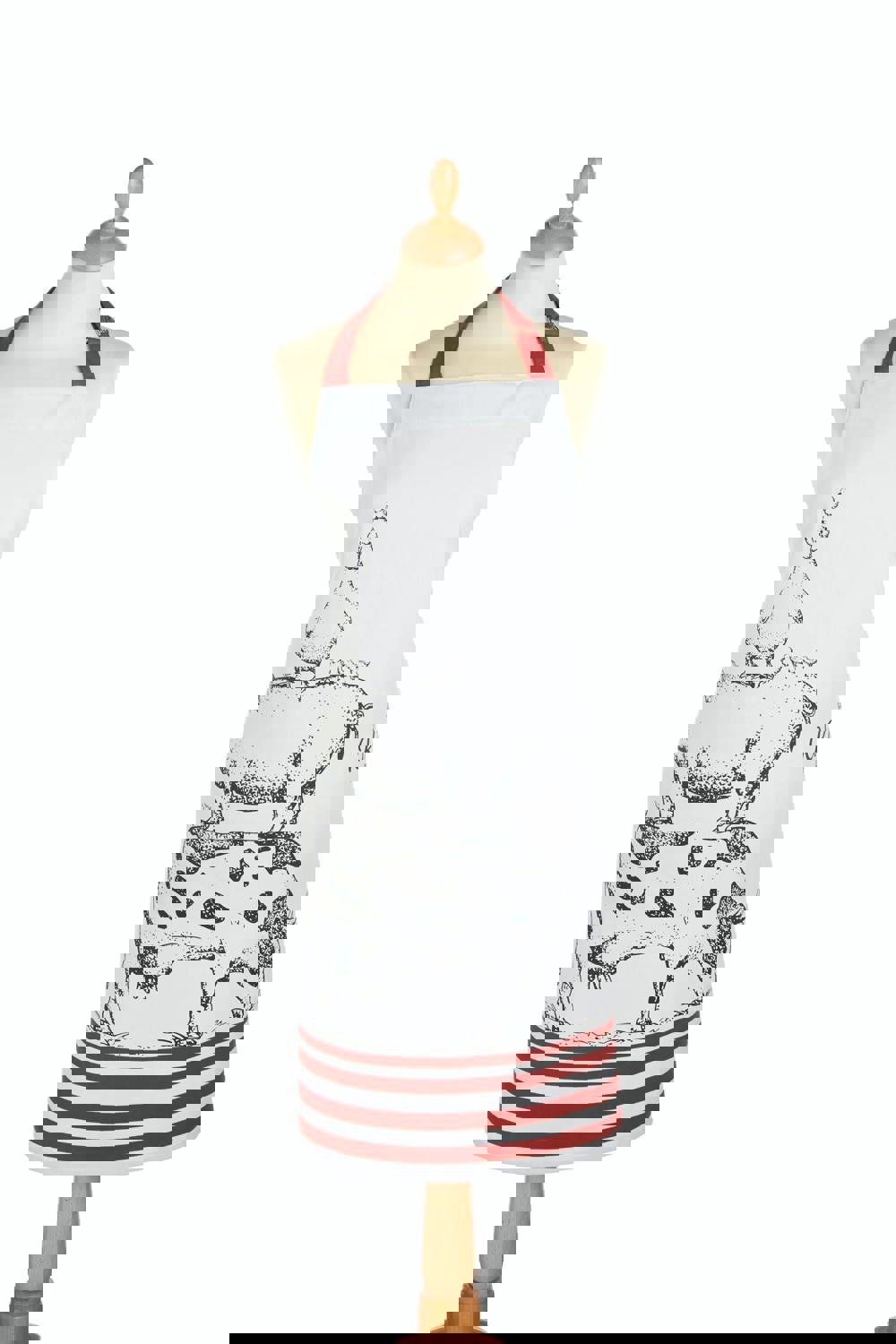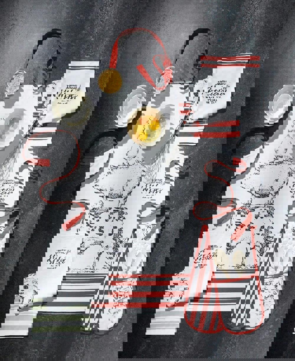 An a-moo-sing, farmyard-themed apron to keep clothes spotless! Whether you’re cooking up a storm or baking a batch of delicious cakes, protect your clothes in style with this quirky 'Farmhouse' apron from KitchenCraft. Made of robust 100% cotton, the chefs’ apron features a charming illustrated print, depicting farmyard animals stacked up on top of one another. This humorous motif is accompanied by burgundy stripes against a clean white background. The halter strap and waist straps are finished in a coordinating shade of burgundy, for a charming, unified look.
