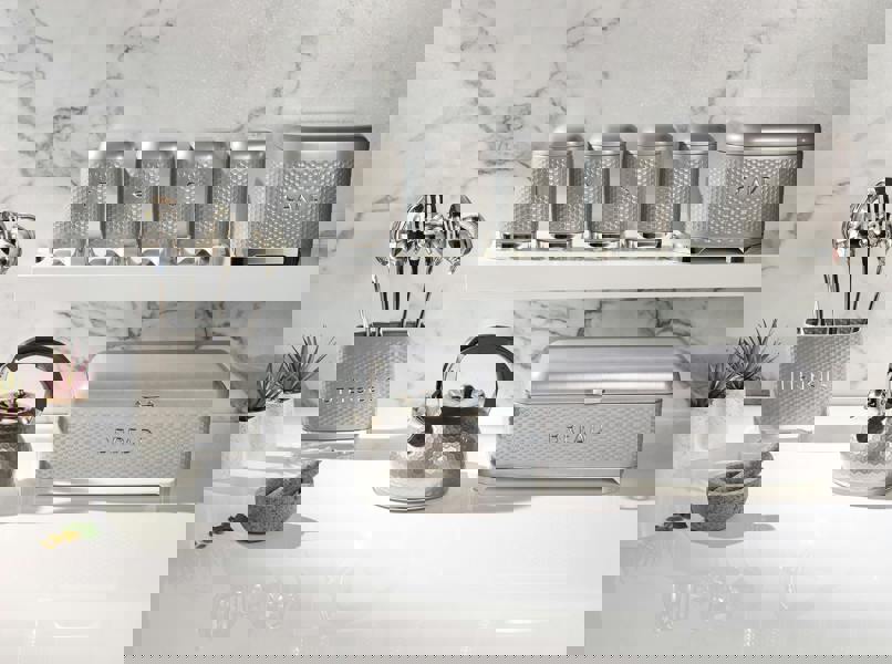 This bread bin is part of KitchenCraft's Lovello Textured collection – a range that combines the sleek curves and contours of retro-inspired design with trendsetting geometric textures. It's the perfect piece for keeping your loaves fresh in statement-making style. The calling card of this thoroughly modern range is its embossed hexagonal surface. This unique finish wraps the bread box, catching glints of light to emphasise the striking geometric design. The effect is at once distinctive and understated, so it makes a fine feature piece for any kitchen. Looks aside, the large size means there's lots of room for your favourite loaves, or for plenty of bagels, crumpets or bread rolls. There's a hinged lid, too, which helps keep them bakery fresh. The bread bin is finished in suave Shadow Grey with shimmering chrome accents and 'BREAD' lettering, so it looks very smart alongside the matching beverage canisters, cake tin and utensil holder.