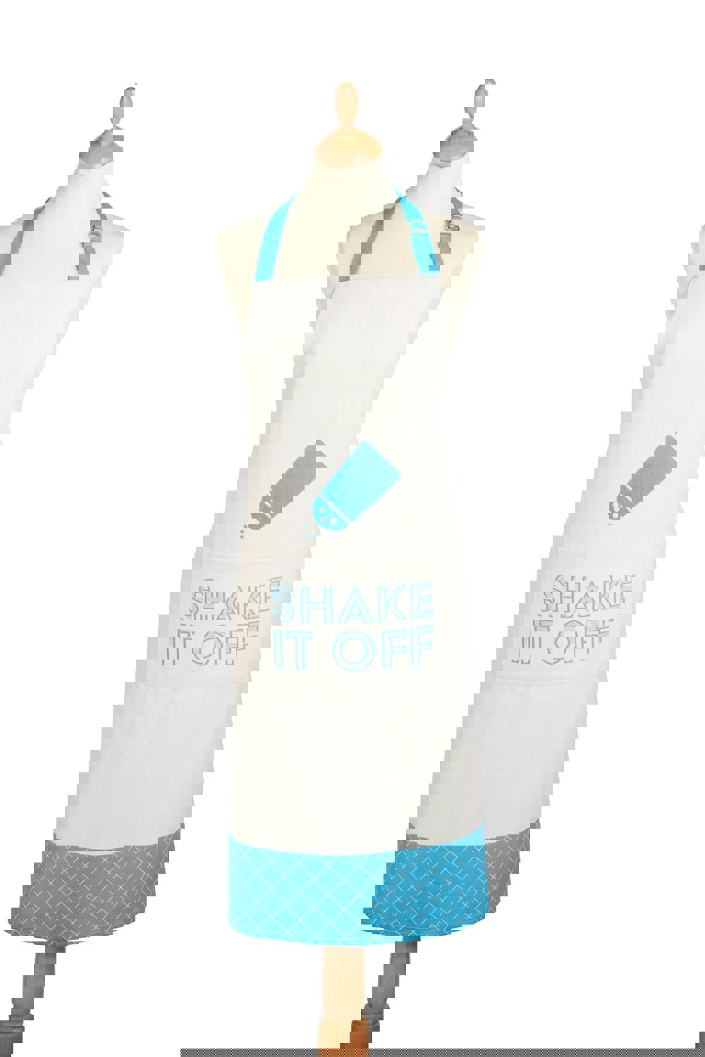 Made of robust 100% cotton, the chefs’ apron features a bright blue flour shaker against a white background, complete with that nugget of modern wisdom, “shake it off”!