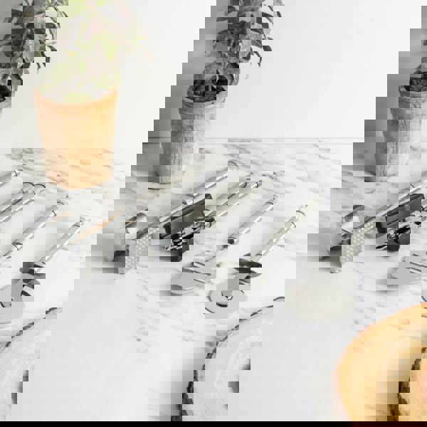 Upgrade your kitchen essentials with the KitchenCraft Oval Handled Professional Stainless Steel Kitchen Tools Set, a durable 4pc collection designed for everyday cooking tasks. This set includes a cheese planer for slicing hard cheeses like cheddar and parmesan, a pizza cutter with a sharp stainless steel wheel for effortless slicing, a meat tenderiser hammer with dual heads for flattening and softening meat, and a reliable manual tin opener with a built-in bottle cap opener.