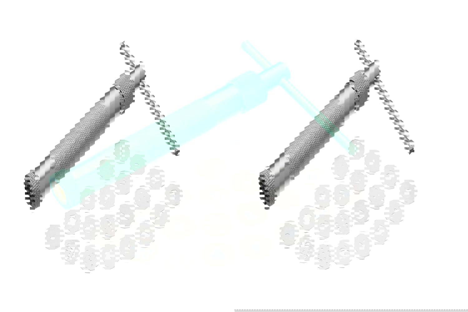 It’s easy. Simply fill it with fondant icing, choose a shaper disc (there are 20 in the set), and turn the handle to start extruding.