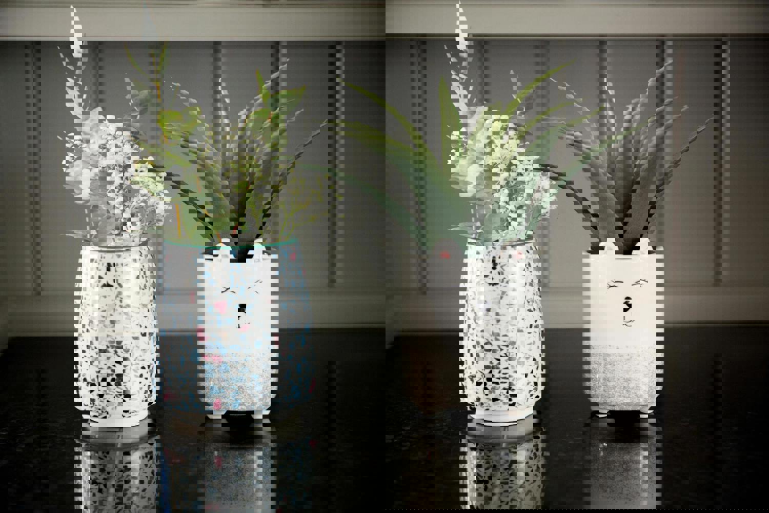 Plants make people happy, that’s a fact. Boost the feel-good factor in your kitchen, hallway, living room or office desk with your favourite bit of greenery, planted in one of these stylish plant pots. Spruce up your space with lucky bamboo, fragrant peppermint, or a cute little cactus. You name it, it will look great in this cute little pot! Taking on the classic Italian terrazzo design, this pot’s pink and blue-hued speckles sit on a light blue background. It’s a traditional yet timeless look, ready to be incorporated into any décor.