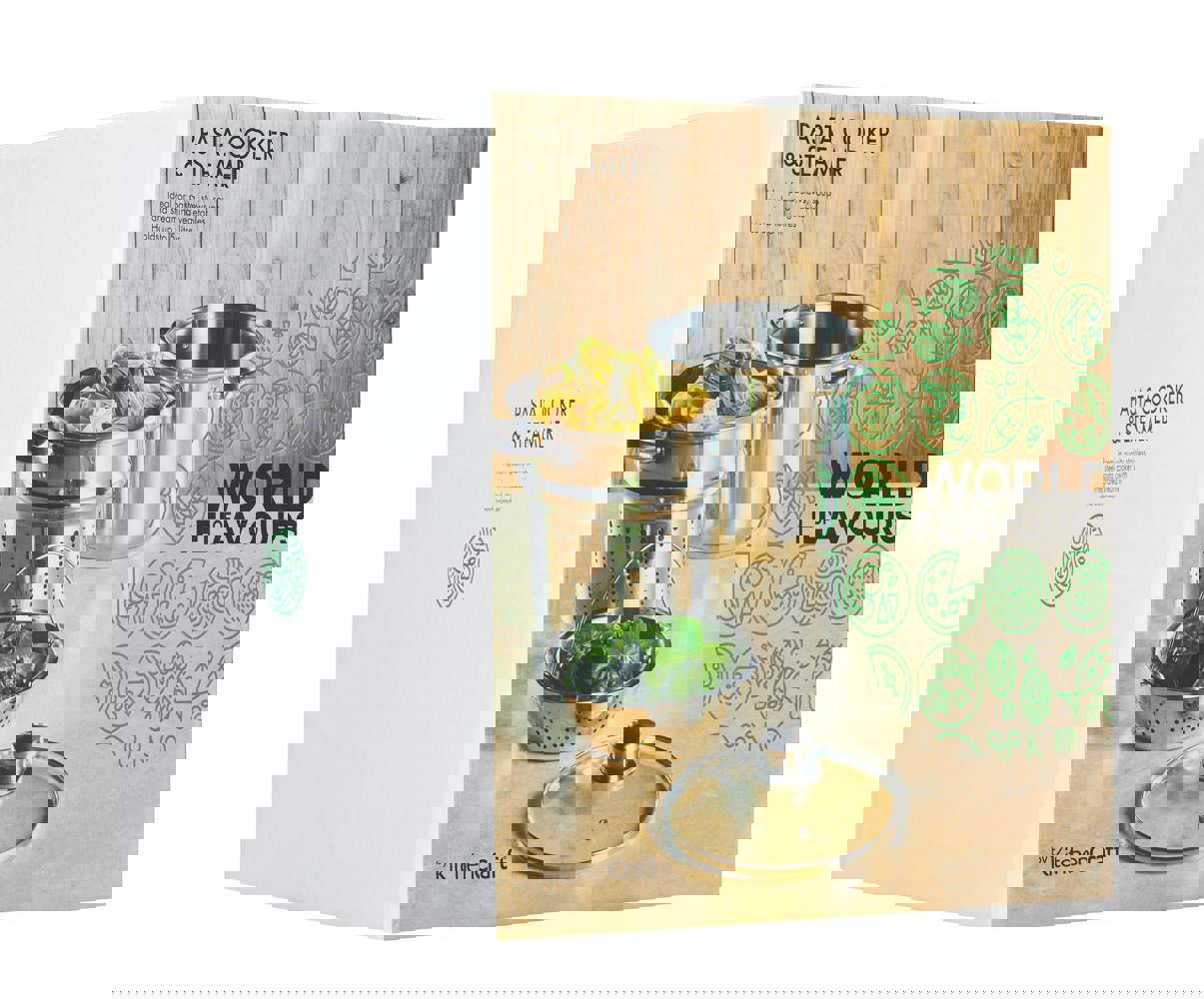That’s not all. It also comes with a steamer insert for cooking veg and other goodies, and a glass lid for quicker cooking. Plus, you can use the outer pan as a standard stockpot, to cook soups, stews and yummy ragus.