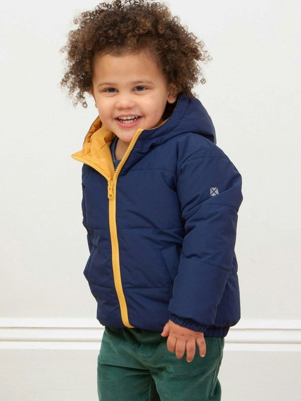 Let's cut to the headline. . . Kite have designed a brilliant reversible coat and are beyond excited! Offering great protection and warmth, this lightweight and easy-to-wear puffer jacket features welt pockets on one side and side seam pockets on the other. Only problem. . . Kite can't decide if the gorgeous classic midnight blue or the stand out ochre yellow star print is their favourite!