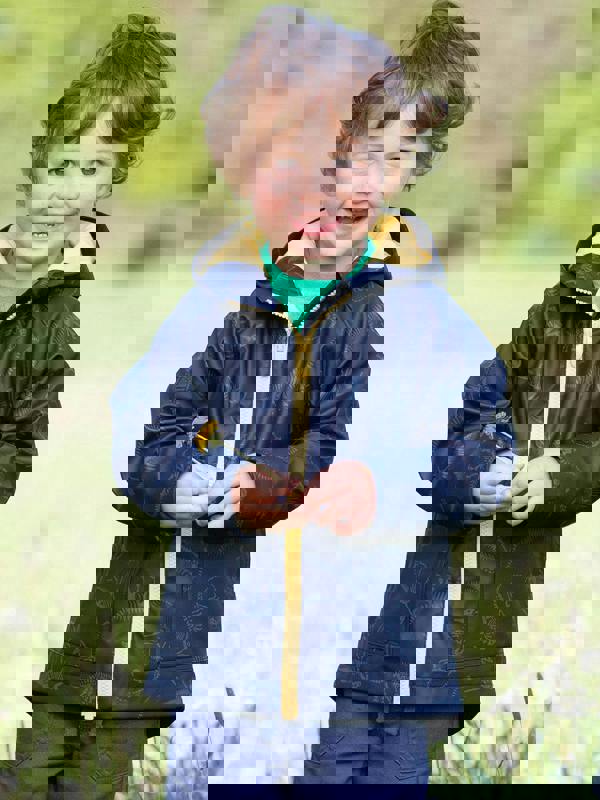 Kite's wonderful zip-through splash coat is designed for as much puddle jumping as you like! Created in their subtle Dino Discovery print with a contrast canary yellow lining, design meets functionality in this great little coat, which will keep you snug and dry all day long.
