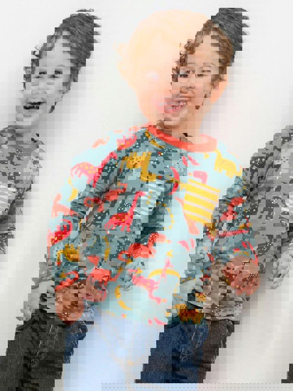 A roar-some favourite in the making! Kite's Dinos And Dragons t-shirt brings together two mighty favourites in one epic all-over print. Finished with a colour pop stripy pocket it's a playful style that's packed with personality.