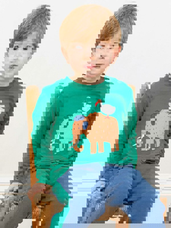 Step back in time with the charming Woolly mammoth t-shirt. Set on an emerald green tee, this playful applique features Kite's friendly woolly mammoth and its quirky dodo bird companion. Kite have used a little artistic license, in the story telling, as these prehistoric animals actually existed on different continents!