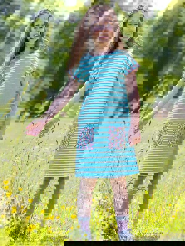 Kite's fabulous shift style dress in lagoon blue and off-white yarn-dyed stripes is inspired by their very own Dorset coastline. This versatile style has signature Kite detailing in its lagoon blue and off-white print, handy patch pockets, sealing the deal on this quality piece.