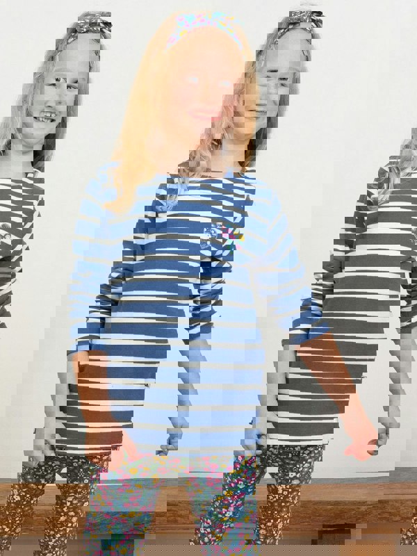 Enjoy this relaxed and comfy style made for every adventure. Featuring a heavier weight single jersey, with a navy blue and cream yarn dyed stripe, this long-sleeved top with side splits looks great paired with Kite's woodland leggings. Spot this gorgeous woodland print on the heart appliqué and back neck facing. Made from 100% organic cotton.
