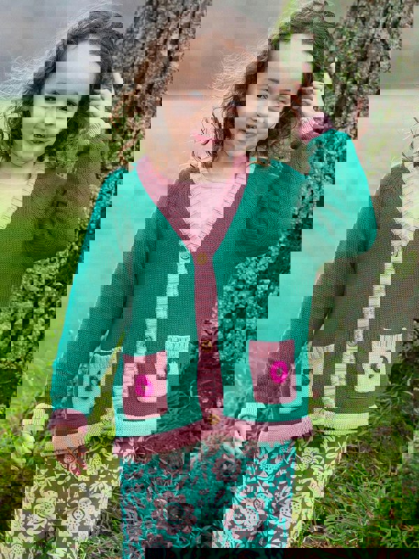 Kite adores this Folksy cardi and know it will become a favourite layer for the season. In a gorgeous green with dusky pink cuffs and hem, plus crochet-style detailing on the handy pockets, this chunky knit adds a touch of cuteness to every outfit.