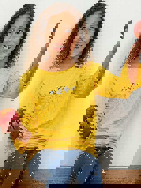 Meet your new wardrobe must-have this season! This standout sweetcorn yellow top features flare and frill sleeves, a lovely floral embroidery on the chest and soft gathers at the yoke. This special number is made with soft and breathable slub fabric. Made from 100% organic cotton.
