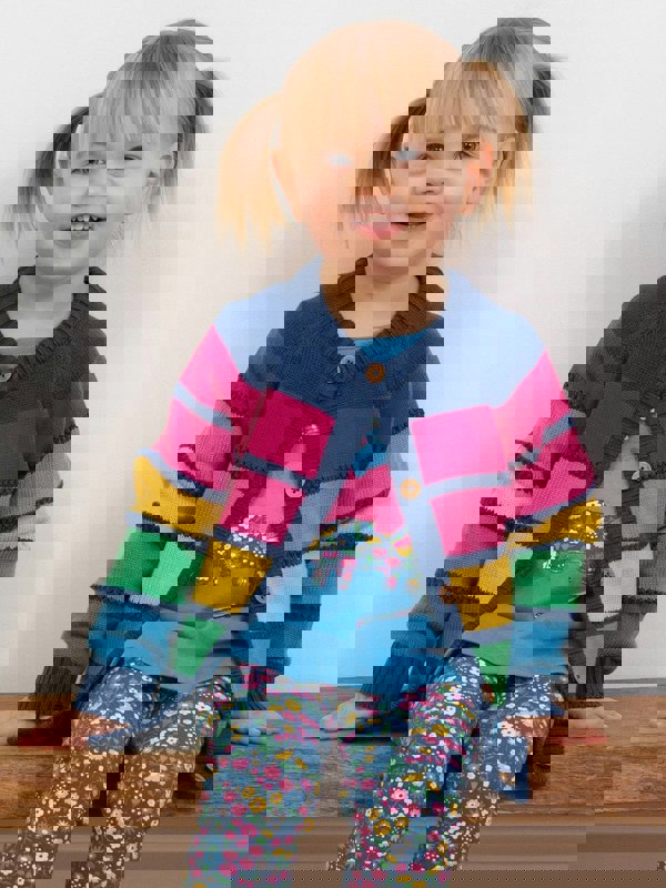 All the colours! We absolutely adore this vibrant cardi and know it will become a favourite layer for the season. Featuring a gorgeous rainbow and navy blue stripe in a beautiful mixed knit design, this midweight knitwear is just the burst of brightness every outfit needs. Complete with coconut buttons, it's made from 100% organic cotton.