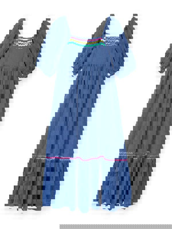 A drapey delight, this beautiful double muslin dress feels as good as it looks. A statement piece that lets the ric rac and beautiful cut do the talking. This style ticks all the boxes this season.