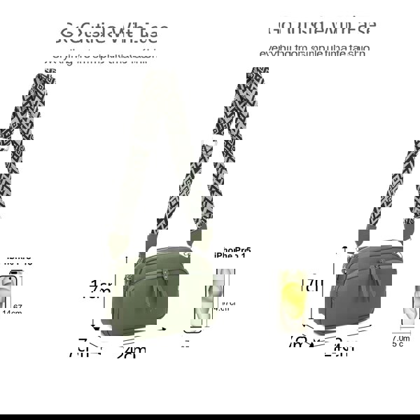 Classic Camera Bag Shape: Features a compact, structured design measuring 24 cm long by 17 cm high by 7 cm wide, sized perfectly for a phone, wallet, and keys.
