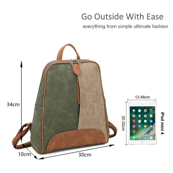 This fashionable color block backpack is perfect for school, travel, or daily adventures. It features a soft, faux suede finish and a modern paneled design. The bag is both stylish and practical, with a spacious main compartment and a convenient front zipper pocket. The comfortable, adjustable straps and a top handle make it easy to carry wherever you go. With external dimensions of 30cm in length, 10cm in width, and 34cm in height, this backpack is a versatile and chic choice.