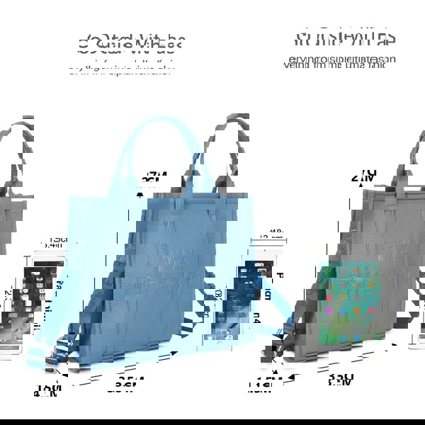 This modern structured tote bag is both stylish and highly functional. It features a bold embossed text design on the front and is made from durable pebbled vegan leather. The bag includes dual top handles for classic carrying and a wide, detachable shoulder strap for comfortable crossbody wear. With generous external dimensions of 33. 5cm in length, 14. 5cm in width, and 27cm in height, it's the perfect size for daily use, work, or travel.