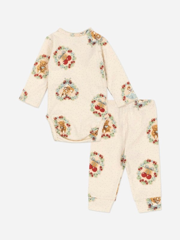 Konges Sløjd baby girls deer diary bodysuit set in ivory for AW2025. The set has a deer motif print and an ivory colourway.