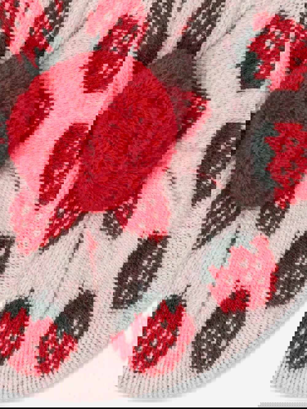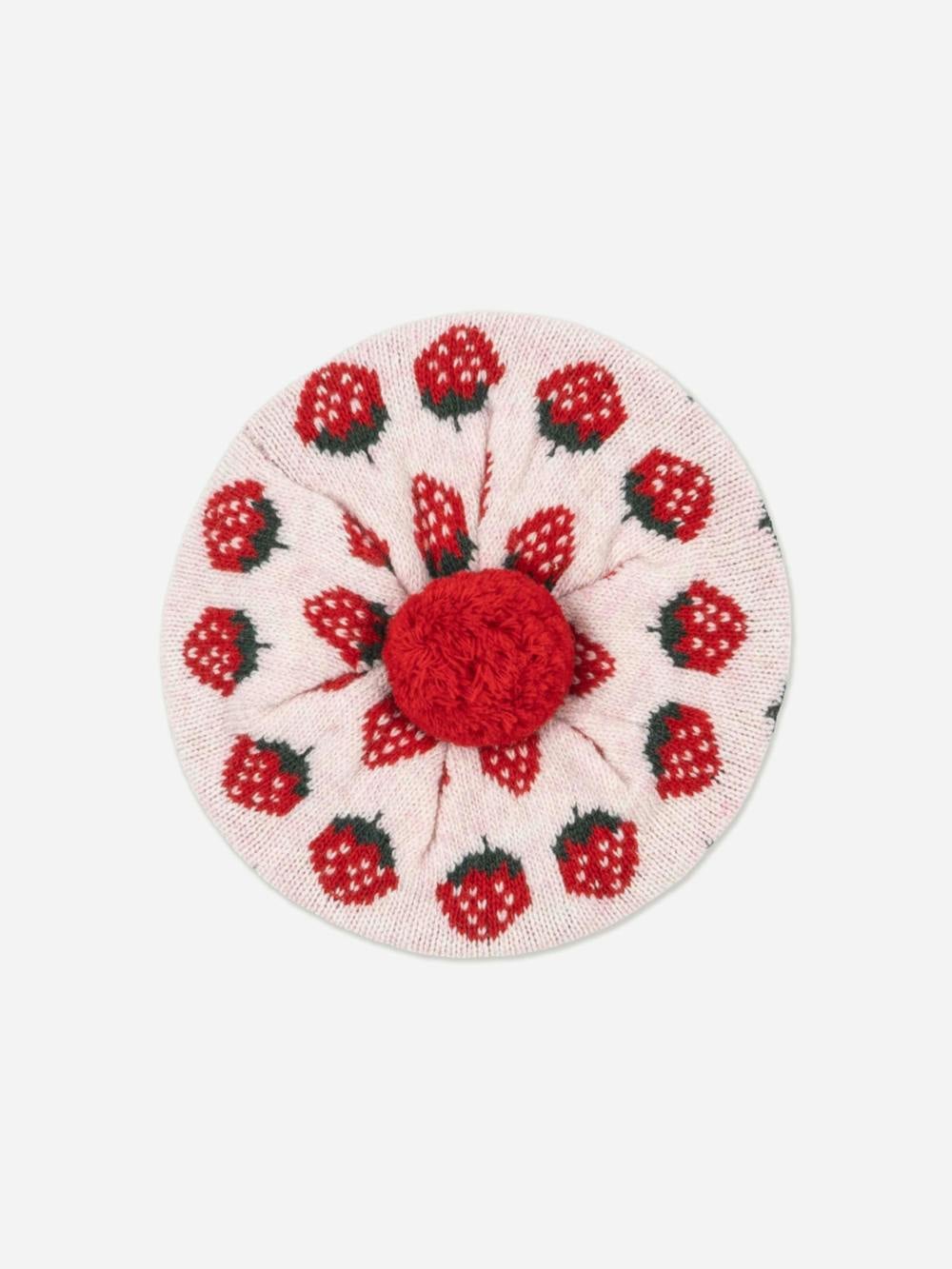 Konges Sløjd Belou knit beret in pink. This girls’ beret comes in a soft, cosy knit with an all-over strawberry motif for a playful finish.