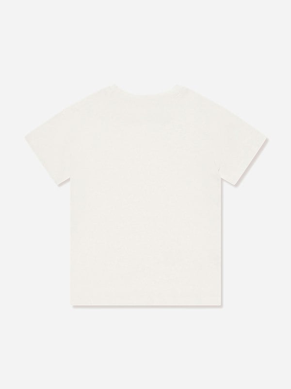 Konges Sløjd Era T-shirt in ivory with a colourful strawberry print and “join the Jam Band” text on the front. A round neckline and short sleeves create a clean, simple shape, finished with a straight hem. Made from a linen and organic cotton blend.